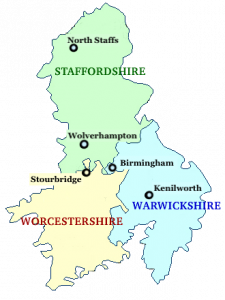 This includes the areas of the old counties as they existed before the major boundary changes of the 19th and 20th centuries, as well as the areas brought into them by those changes. In particular the modern metropolitan boroughs of Birmingham, Coventry, Dudley, Sandwell, Solihull, Walsall and Wolverhampton (collectively known as the West Midlands) are within our area. The metropolitan boroughs of Dudley, Sandwell, Walsall and Wolverhampton are also sometimes collectively referred to as “The Black Country”